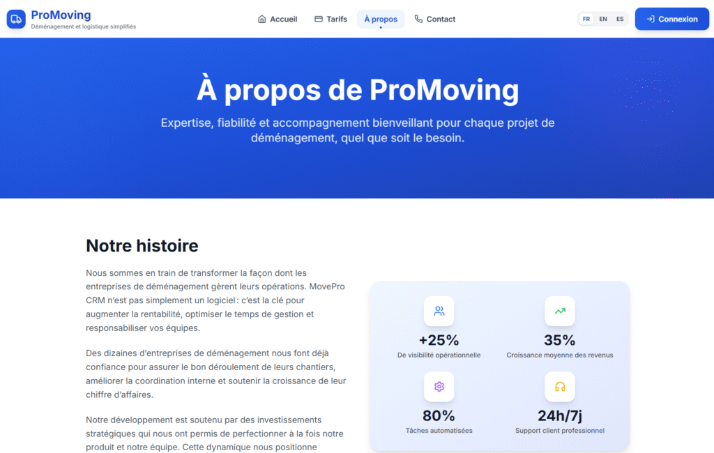 Gérez vos déménagements sans stress. Avec ProMoving CRM, centralisez clients, devis et plannings dans une seule plateforme intuitive. La solution simple et efficace pour gérer vos déménagements.